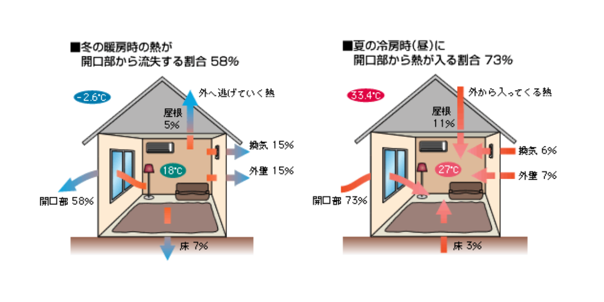 日本建材・住宅設備産業協会のデータによると、冬の暖房時に開口部から失われる熱は58%、夏の冷房時に開口部から入る熱は73%にも及びます。
