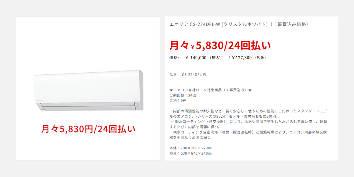例えば、エアココの自社ローン対象製品「エオリアCS-224DFL-W[クリスタルホワイト]/¥140,000(税込)」の場合、月々の返済は工事費込みで「¥5,830(24回払い)」となります。